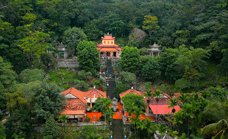 – Hệ thống bậc thang đá dẫn lên chùa tạo cảm giác trang nghiêm, hòa quyện giữa kiến trúc và thiên nhiên núi rừng xanh mát.