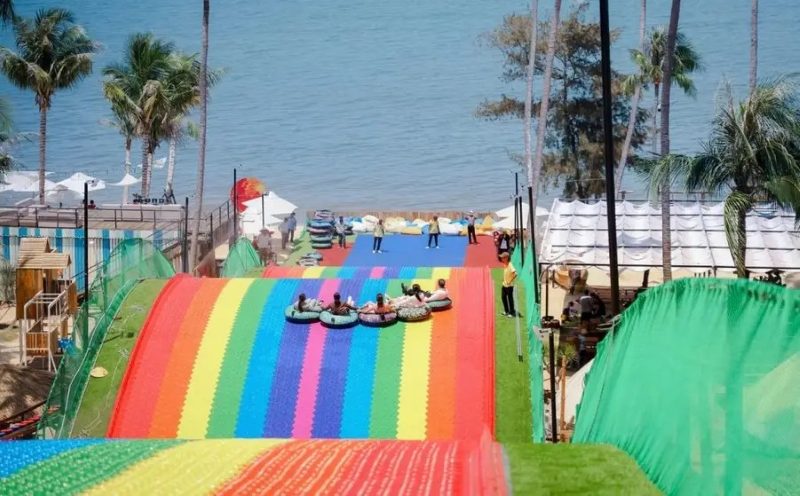 Điểm nhấn đặc biệt tại đây là đường trượt phao khô lớn nhất Bình Thuận. Công trình được thiết kế với độ cao và độ dốc đạt tiêu chuẩn an toàn, bề mặt trượt chuyên dụng giúp giảm ma sát và đảm bảo vận tốc ổn định. Người chơi ngồi trên phao tròn chuyên dụng, tay nắm cố định hai bên, trượt từ đỉnh dốc xuống theo đường trượt dài và uốn lượn nhẹ. Trải nghiệm mang lại cảm giác phấn khích, sôi động nhưng vẫn an toàn nhờ hệ thống kiểm soát tốc độ và khu vực tiếp đất được thiết kế hợp lý.